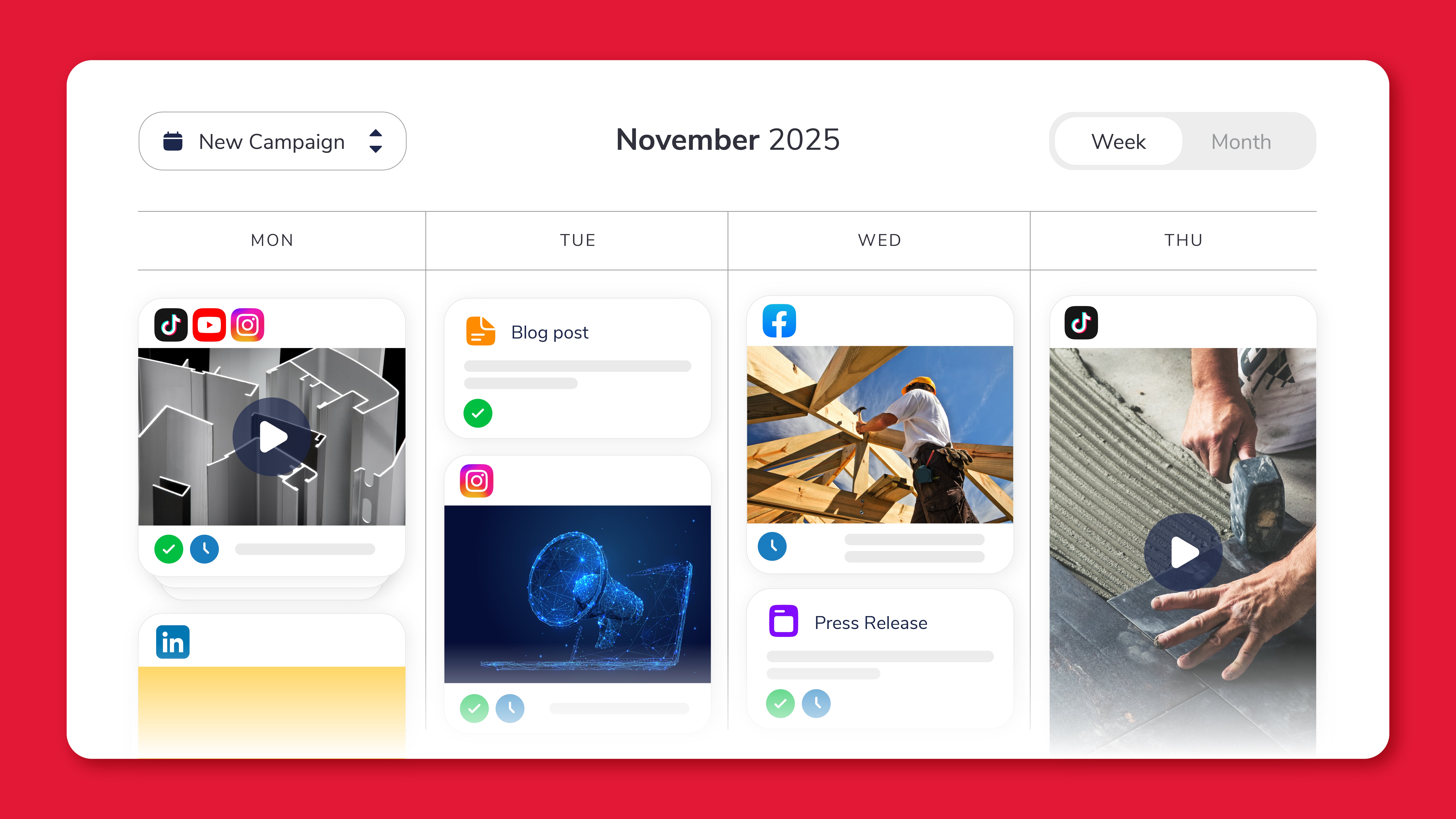 How can your building and construction brand stay active and engaged with curious users? Building a strategic social media calendar is essential for keeping your brand visible, organized, and aligned with broader marketing goals. By defining clear objectives, mapping content pillars, and aligning with seasonal industry moments, brands can transform their channels into powerful storytelling and engagement tools. Ultimately, a well-planned, yet flexible calendar helps building materials brands stay relevant, foster authentic relationships, and connect meaningfully with their audiences year-round.